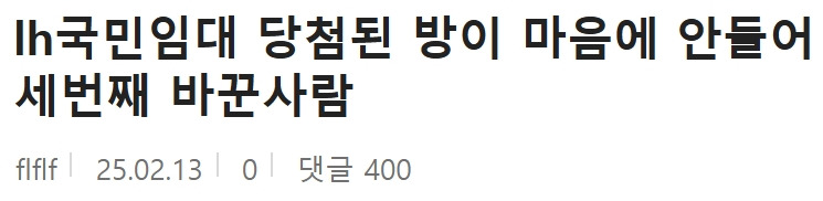 LH 국민임대 당첨된 방이 마음에 안들어 세번째 바꾼사람 11월 16, 2025 작성자: ddd 댓글 남기기 응답 취소댓글이름 이메일 웹사이트 다음 번 댓글 작성을 위해 이 브라우저에 이름, 이메일, 그리고 웹사이트를 저장합니다. Δ
